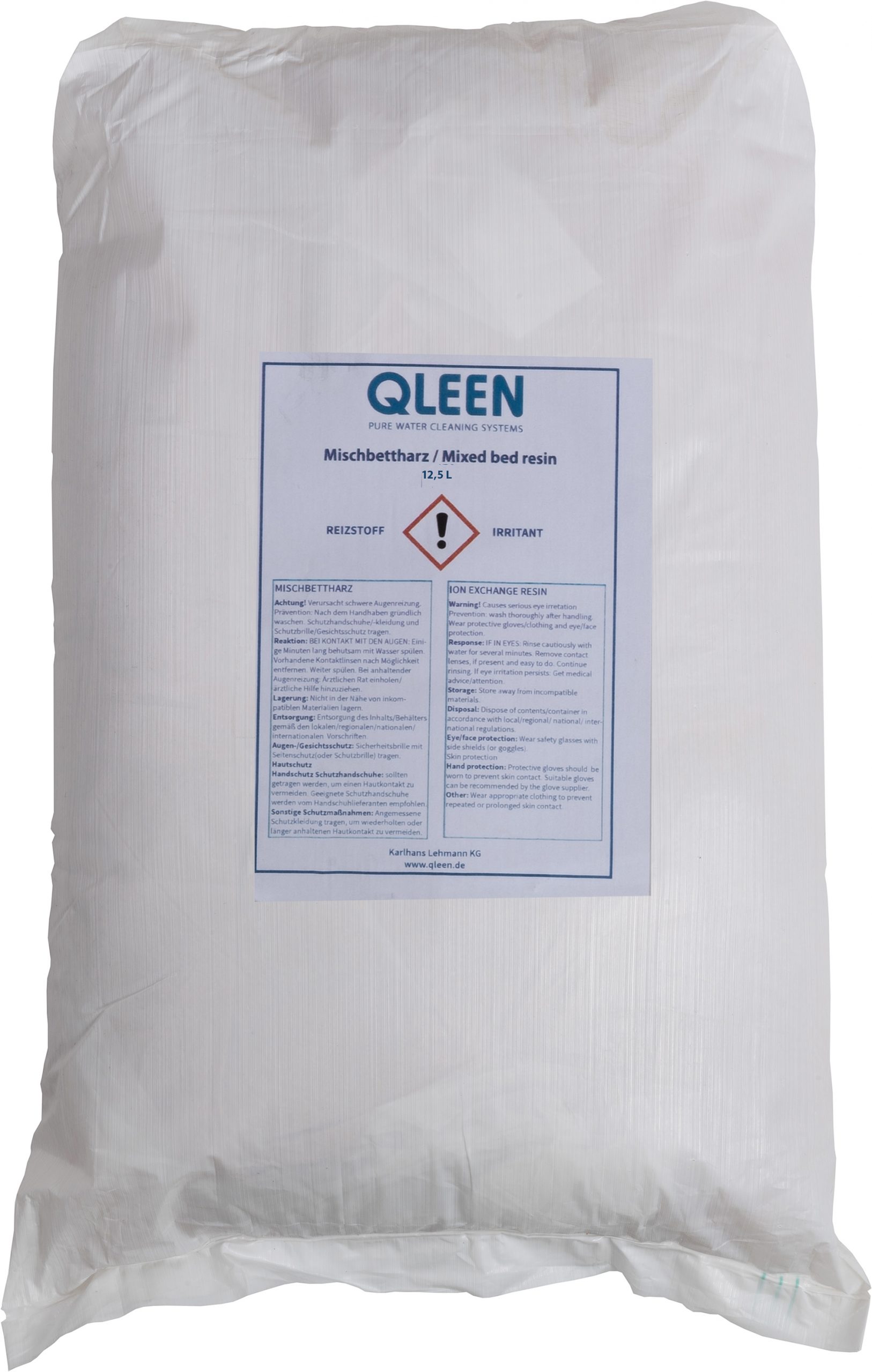 Der 12,5 L Sack enthält ausreichend Granulat für den professionellen Einsatz und ist ideal für Reinwassersysteme in Gebäudereinigung, Wintergärten oder großen Glasfassaden.
